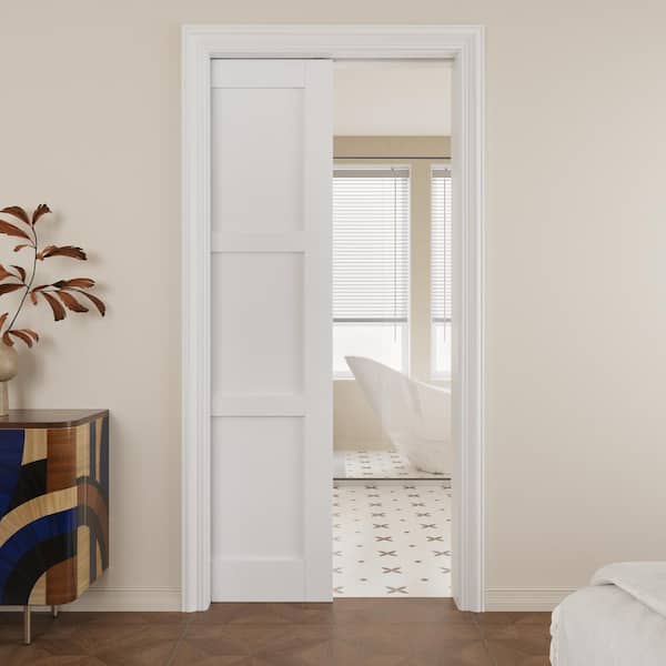 36 in. x 80 in. White Primed 3 Lite MDF Door with Solid Core Pocket Sliding Door Frame with Hardware and Soft Close