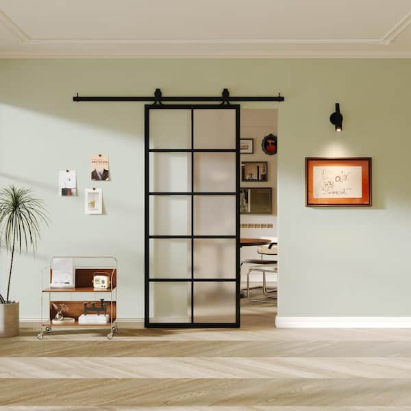 36 in. x 84 in. 10 Lite Tempered Frosted Glass Black Finished Solid Core Aluminum Barn Door Slab with Hardware Kit
