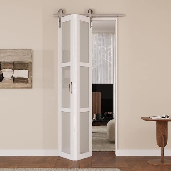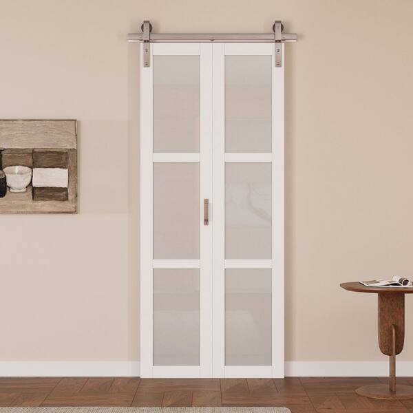 36 in. x 84 in. 3-Lite Tempered Frosted Glass White Finished MDF Bi-Fold Sliding Barn Door with Hardware Kit Nickel