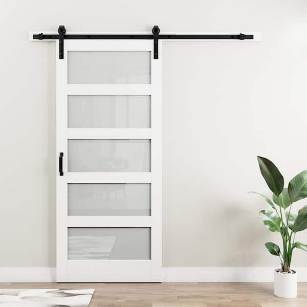 36 in. x 84 in. 5-Lite with Frosted Glass White MDF Pre-Drilled Sliding Barn Door with Hardware Kit Soft Close Include
