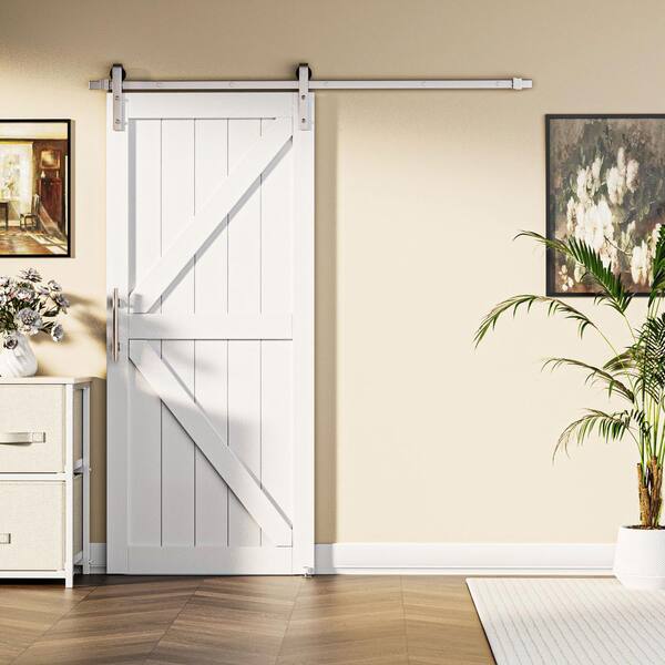 36 in. x 84 in. Paneled White Primed MDF British K-Shape MDF Sliding Barn Door with Hardware Kit Nickel-Plated
