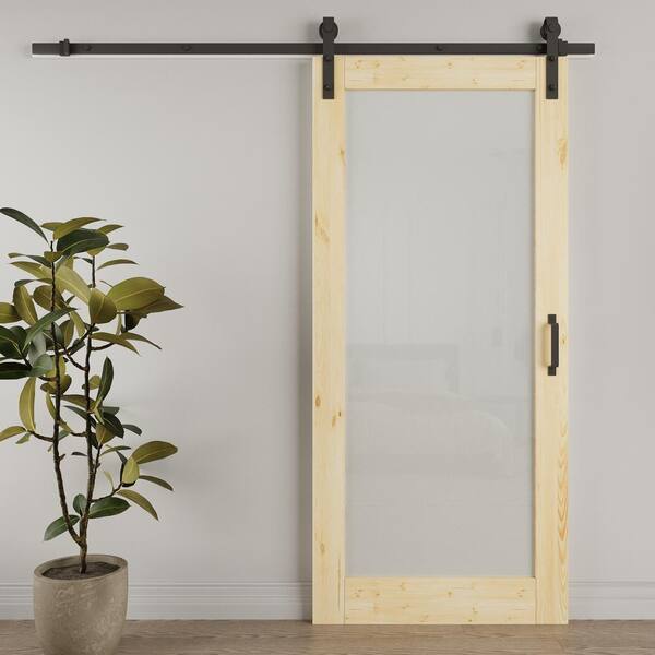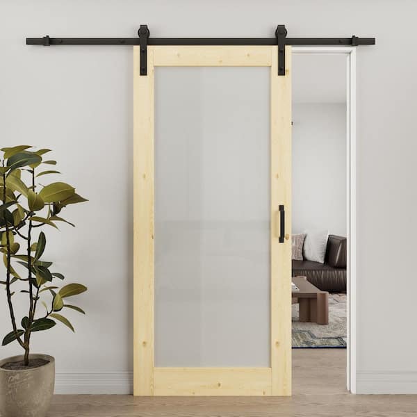 36 in. x 96 in. 1 Lite Tempered Frosted Glass Unfinished Solid Core Pine Wood Sliding Barn Door with Hardware Kit