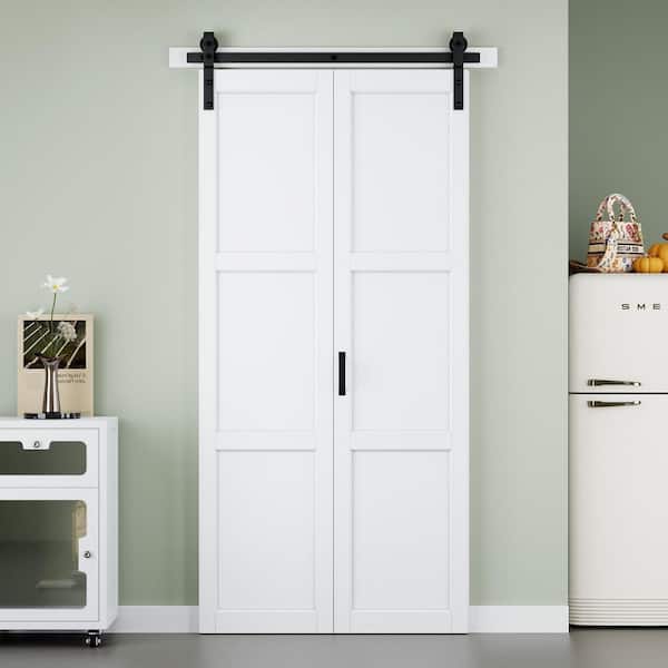 40 in. x 84 in. Easy Install 3-Panel White Primed Solid Core MDF Composite Bi-Fold Sliding Barn Door with Hardware Kit