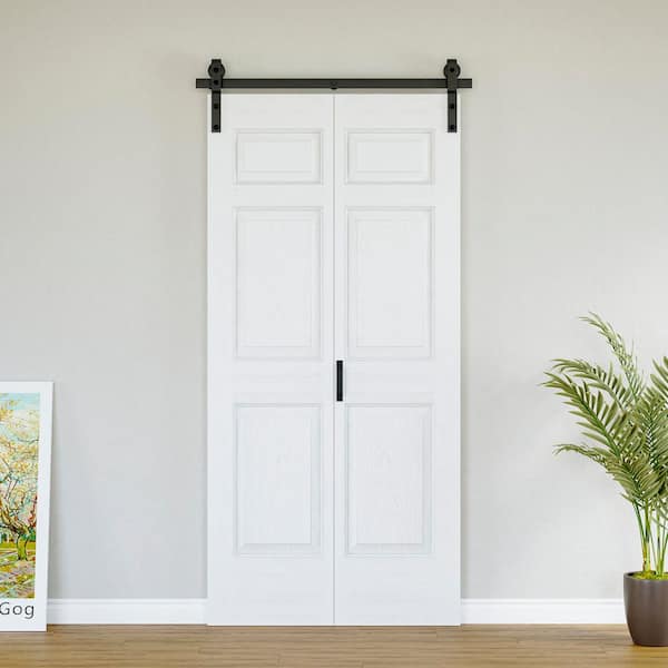 40 in. x 84 in. Paneled 6-Lite White Primed Hollow Core MDF Composite Bi-Fold Door with Bifold Barn Door Hardware