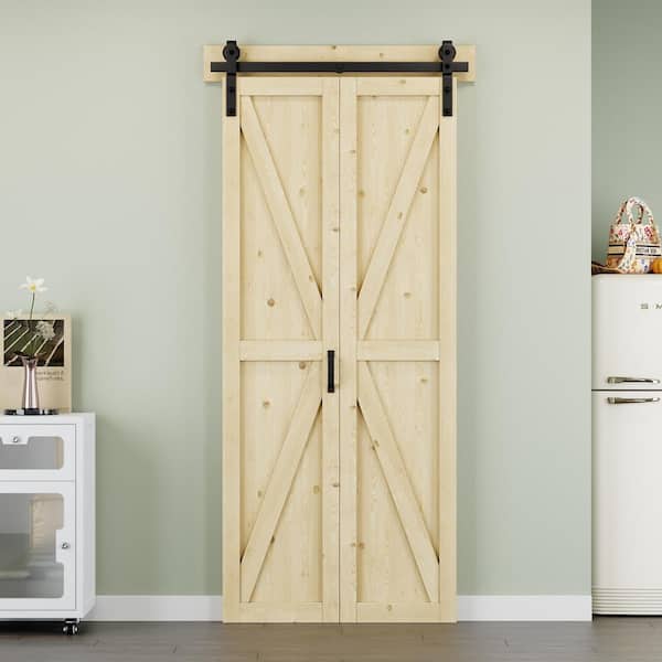 40 in. x 84 in. Paneled K Shape Solid Pine Wood Unfished Bi-fold Sliding Barn Door with Hardware Kit and Handle