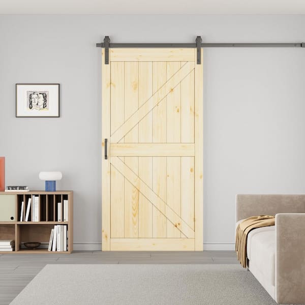 42 in. x 84 in. K-Shape Solid Core Pine Wood Unfinished Sliding Barn Door Slab with Hardware Kit and Soft Close