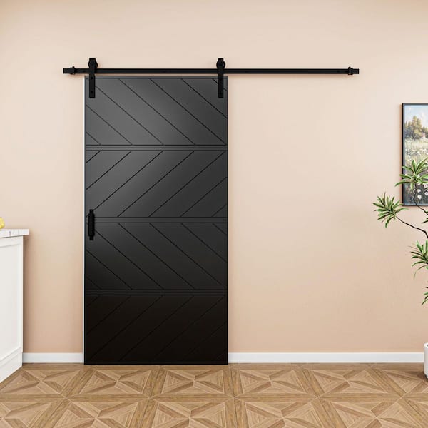 42 in. x 84 in. Paneled 4-Segments Wave Design Black MDF Sliding Barn Door Slab with Installation Hardware Kit