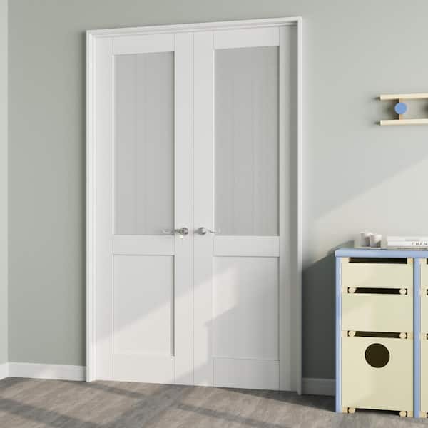 48 in. x 80 in. 1/2-Lite Frosted Glass White Solid Core Wood Double French Door with Quick Assemble Jamb