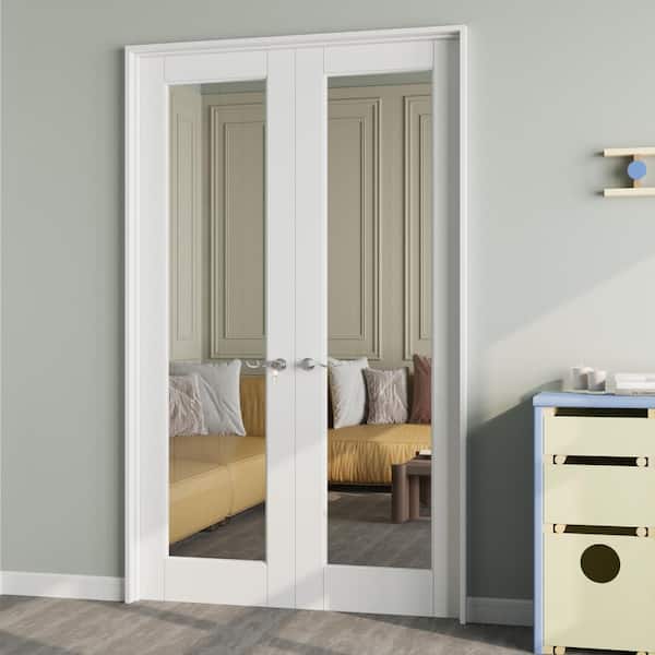 48 in. x 80 in. 1-Lite Clear Glass Universal White Solid Core Wood Double French Door with Quick Assemble Jamb