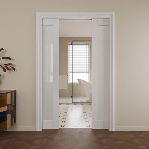48 in. x 80 in. 1-Lite Frosted Glass Primed Door with Solid Core Pine Pocket Door Frame with Hardware and Soft Close
