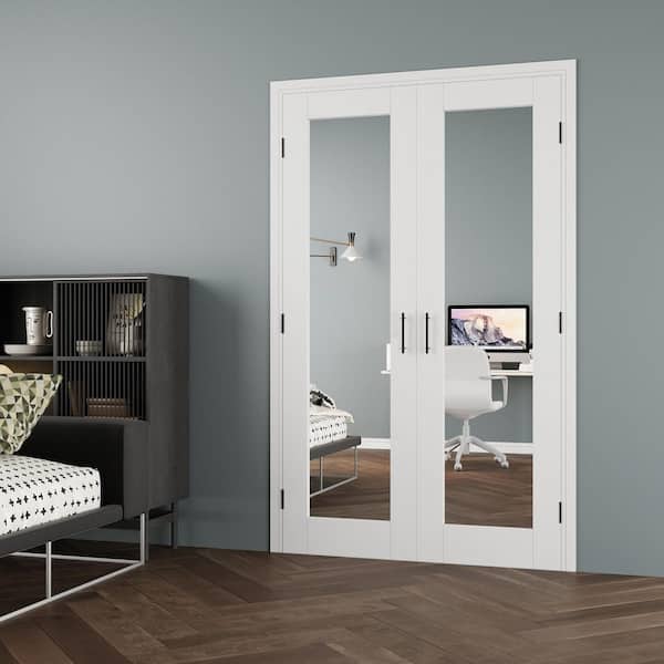 48 in. x 80 in. 1-Lite Mirrored Glass Universal White Solid Core Glass Double Prehung French Door +Quick Jamb&Ball Catch