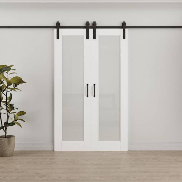 48 in. x 80 in. 1-Lite Tempered Frosted Glass White Primed MDF Composite Sliding Barn Door with Hardware Kit
