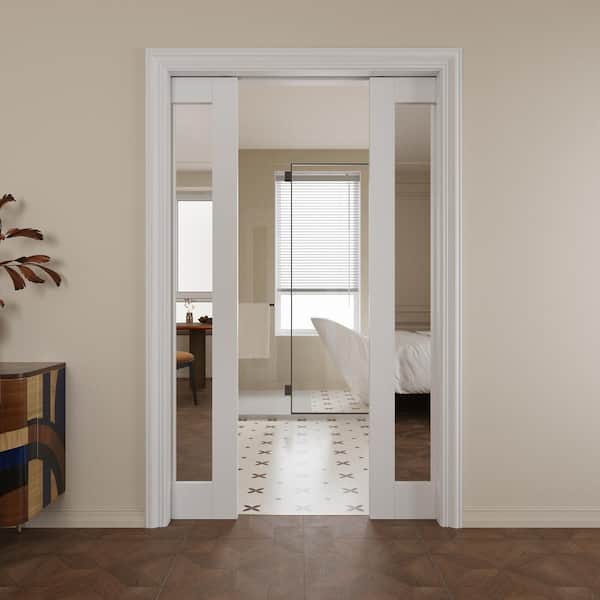 48 in. x 80 in. 1-Lite White Mirrored Glass Primed MDF Wood Pocket Sliding Door with Pocket Door Frame and Hardware Kit