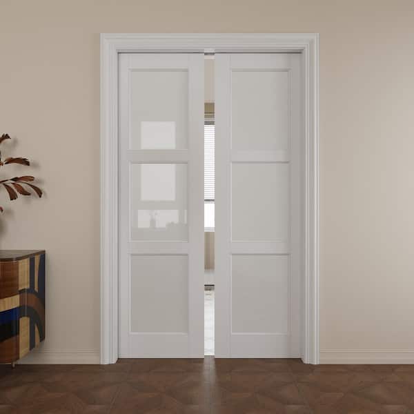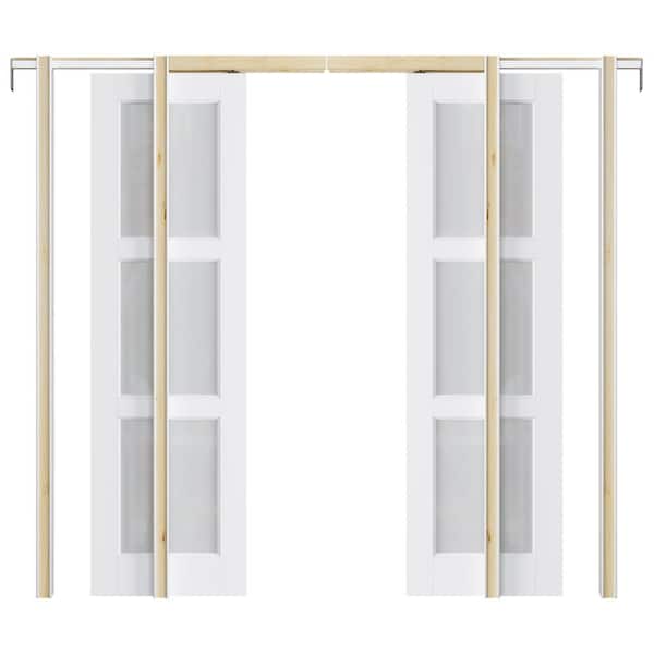 48 in. x 80 in. 3-Lite Frosted Glass White Primed MDF Pocket Sliding Door with Pocket Door Hardware Set and Soft Close