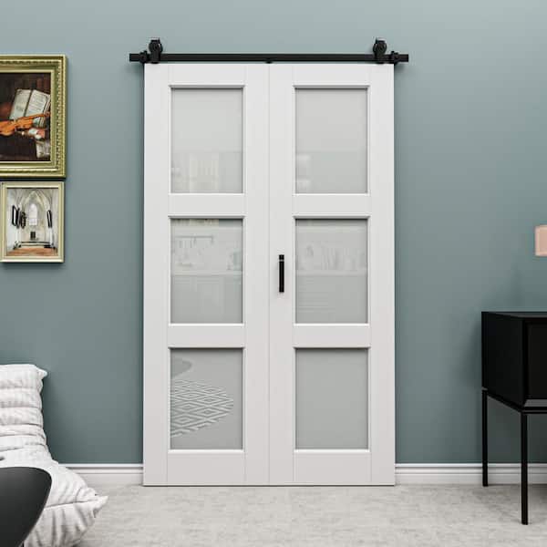 48 in. x 80 in. 3-Lite Tempered Frosted Glass White Finished Glass Bi-Fold Sliding Barn Door with Hardware Kit