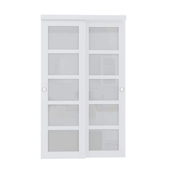 48 in. x 80 in. 5-Lite Frosted Glass Primed White MDF Interior Closet Sliding Door Sliver Handles and Hardware
