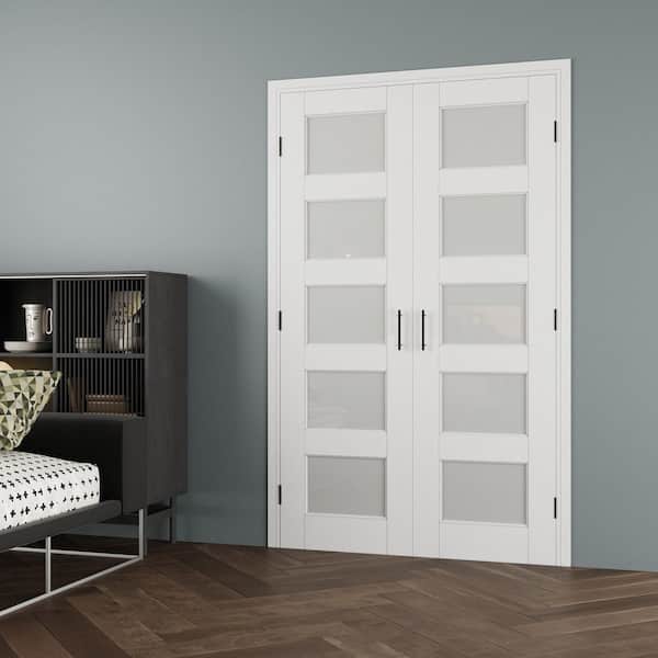 48 in. x 80 in. 5-Lite Frosted Glass Universal White Solid Core Glass Double Prehung French Door + Quick Jamb&Ball Catch