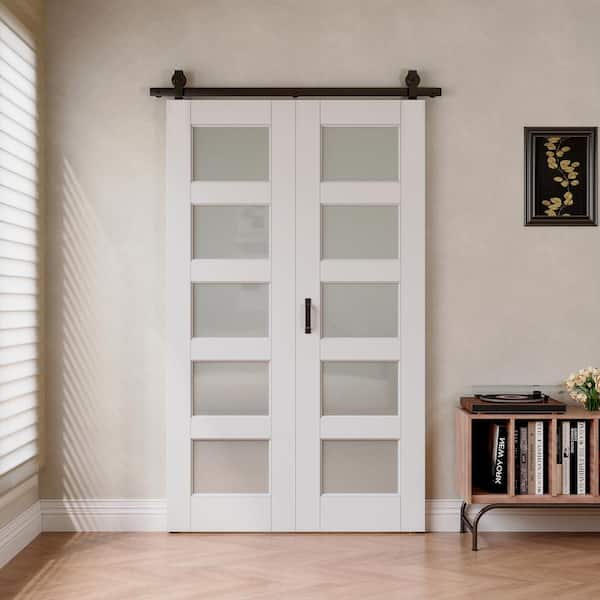 48 in. x 80 in. 5 Lite Tempered Frosted Glass White Primed Bifold Sliding Barn Door with Hardware Kit