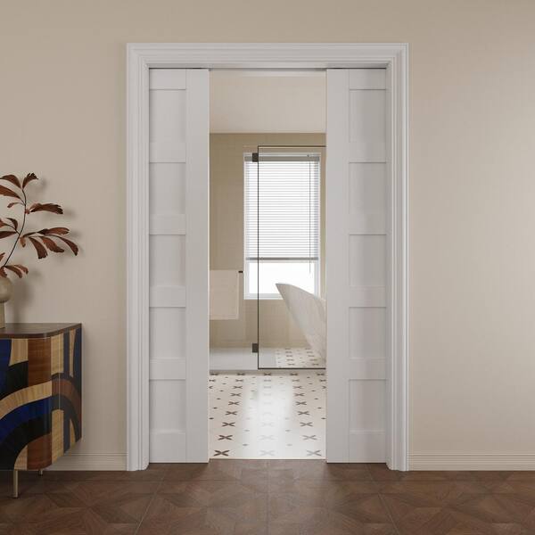 48 in. x 80 in. 5-Lite White Primed Solid Core Door Slab with Wood Pocket Door Frame and Hardware (Soft Close Included)