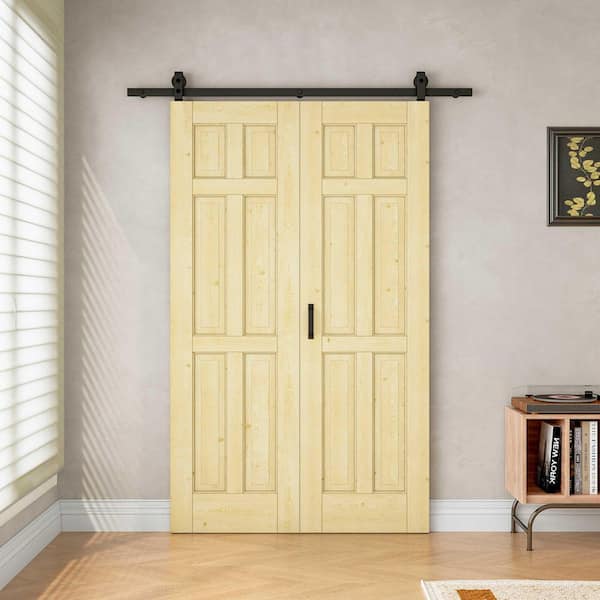48 in. x 80 in. 6-Lite Panel Unfinished Solid Core Pine Wood Bifold Sliding Barn Door with Hardware Kit