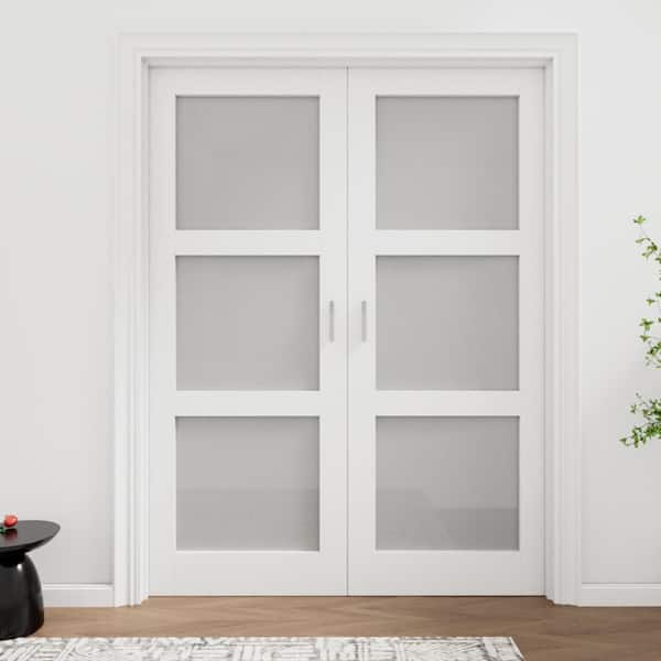 48 in. x 80 in. Universal 3-Lite Clear Glass White Solid Core Glass Double Prehung French Door + Quick Assemble Jamb