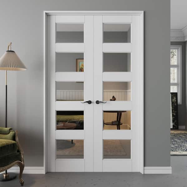 48 in. x 80 in. Universal 5-Lite Clear Glass White Solid Core Wood Double Prehung French Door with Quick Assemble Jamb