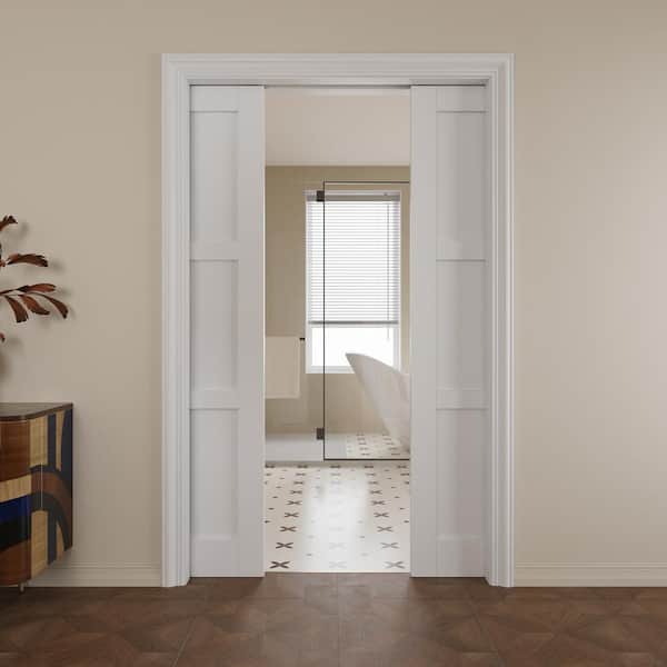 48 in. x 80 in. White Primed 3-Lite MDF Door with Solid Core Pocket Sliding Door Frame with Hardware and Soft Close