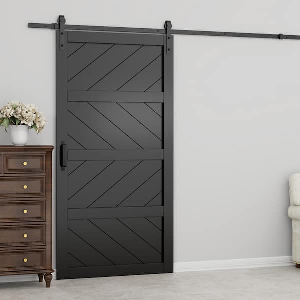 48 in. x 84 in. 4-Lites Black Wave MDF Barn Door Slab with Installation Hardware Kit