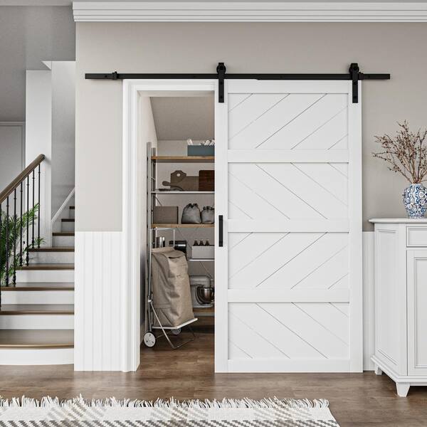 48 in. x 84 in. 4-Lites White Wave MDF Barn Door Slab with Installation Hardware Kit
