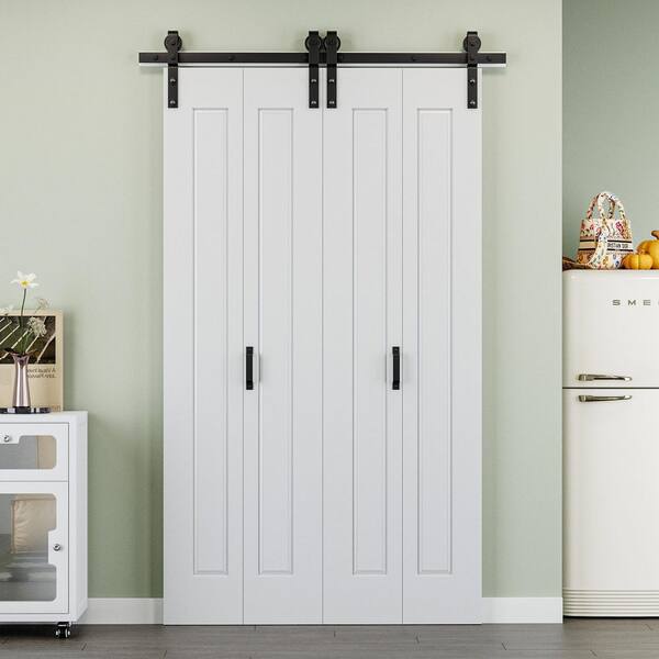 48 in. x 84 in. Paneled 1-Lite White Primed MDF Composite Bi-fold Sliding Barn Door with Hardware Kit and Handle