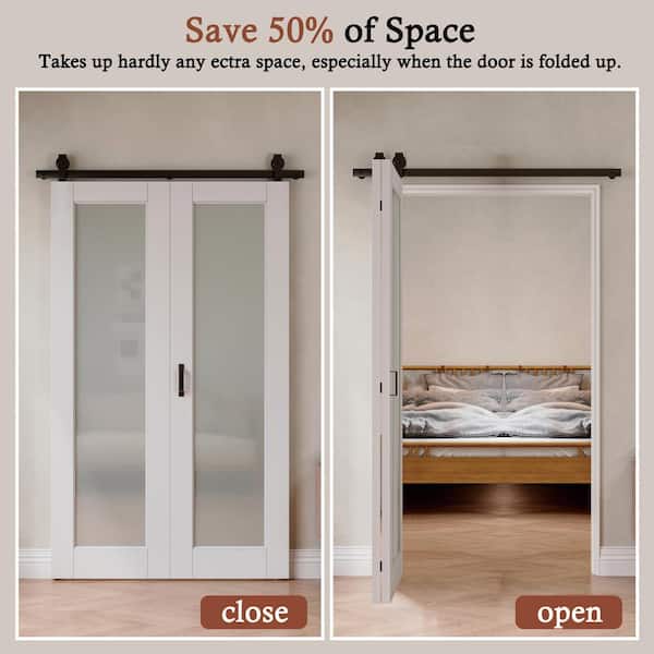 48 in. x 96 in. 1-Lite Tempered Frosted Glass White Primed MDF Bifold Sliding Barn Door with Hardware Kit