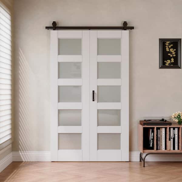 48 in. x 96 in. 5 Lite Tempered Frosted Glass White Primed MDF Bifold Sliding Barn Door with Black Finish Hardware Kit