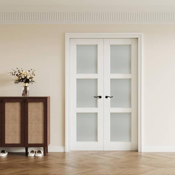 48 in. x 96 in. Universal Handed 3-Lite Frosted Glass White Solid Core MDF Prehung French Door with Quick Assemble Jamb
