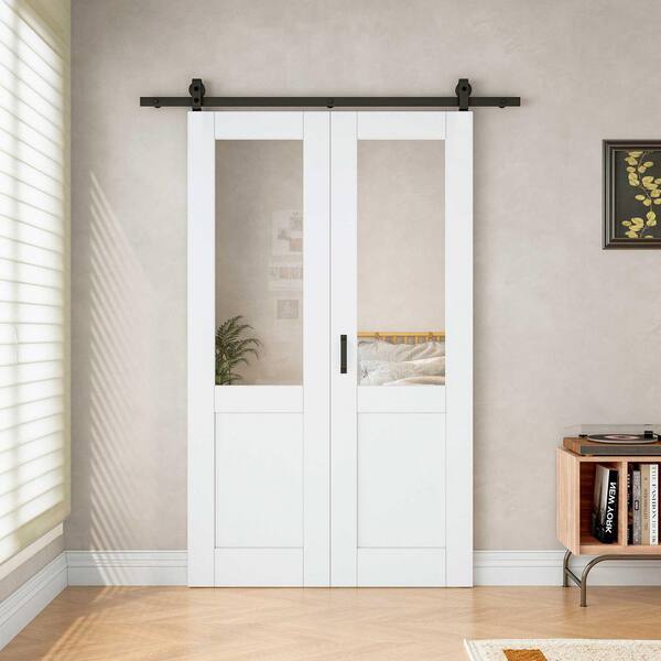 56 in. x 80 in. 1/2-Lite Tempered Clear Glass White Primed MDF Bifold Sliding Barn Door with Hardware Kit