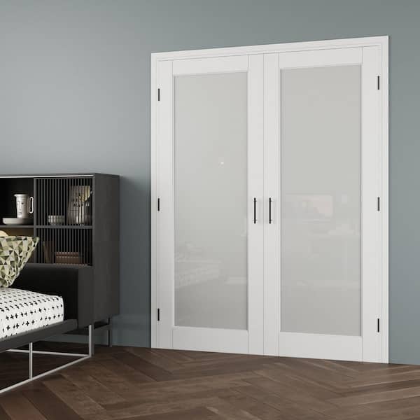 56 in. x 80 in. 1-Lite Frosted Glass Universal White Solid Core MDF Double Prehung French Door+Separate Jamb&Ball Catch