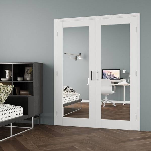 56 in. x 80 in. 1-Lite Mirrored Glass Universal White Solid Core Glass Double Prehung French Door+Quick Jamb&Ball Catch