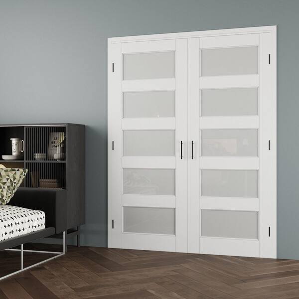 56 in. x 80 in. 5-Lite Frosted Glass Universal White Solid Core Glass Double Prehung French Door + Quick Jamb&Ball Catch