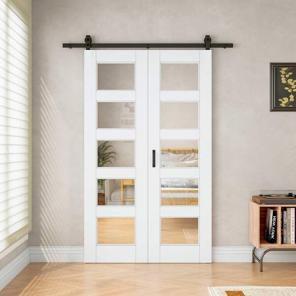 56 in. x 80 in. 5-Lite Tempered Clear Glass White Primed MDF Bifold Sliding Barn Door with Hardware Kit
