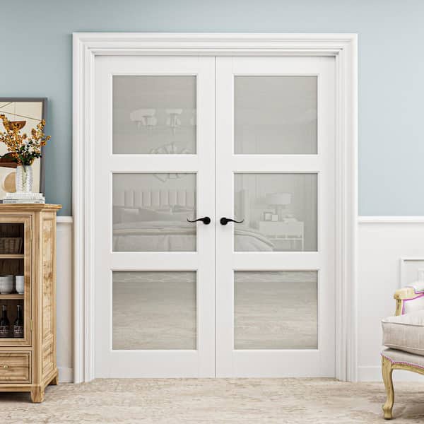 56 in. x 96 in. Universal Handed 3-Lite Frosted Glass White Solid Core MDF Double French Door with Quick Assemble Jamb