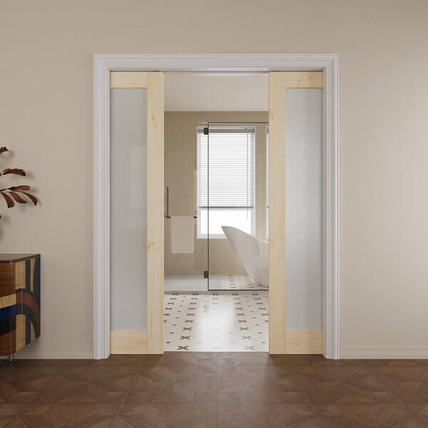 60 in. x 80 in. 1-Lite Frosted Glass Solid Core Pine Wood Unfinished Pocket Sliding Door with Pocket Door Hardware