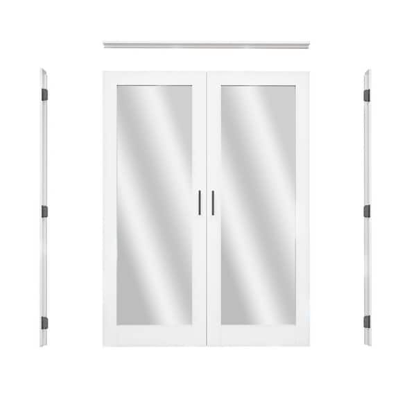 60 in. x 80 in. 1-Lite Mirrored Glass Universal White Solid Core Glass Double Prehung French Door +Quick Jamb&Ball Catch