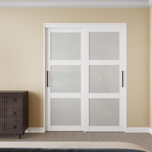 60 in. x 80 in. 3-Lite Frosted Glass White Finished MDF Interior Sliding Door with Hardware and Black Handles