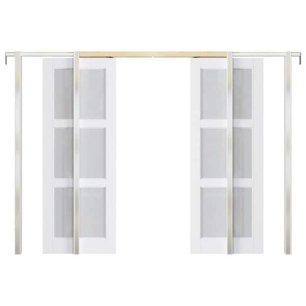 60 in. x 80 in. 3-Lite Frosted Glass White Primed MDF Pocket Sliding Door with Pocket Door Hardware Set and Soft Close