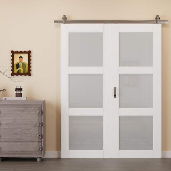 60 in. x 80 in. 3-Lite Tempered Frosted Glass White Primed Glass Bifold Sliding Barn Door with Hardware Kit