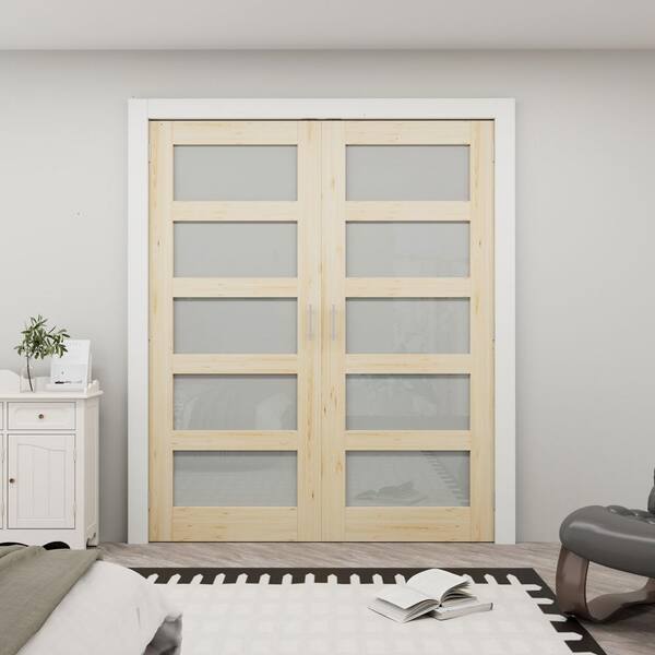 60 in. x 80 in. 5-Lite Frosted Glass Solid Core Unfinished Pine Glass Panels without Jamb Bi-fold Door with Ball Catch