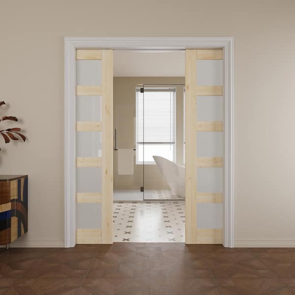 60 in. x 80 in. 5-Lite Frosted Glass Unfinished Solid Core Pine Wood Pocket Sliding Door with Hardware and Soft Close