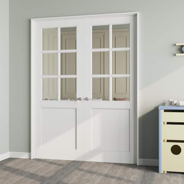 60 in. x 80 in. 6-Lite Clear Glass Unicerse White Solid Core Wood Double Prehung French Door with Quick Assemble Jamb