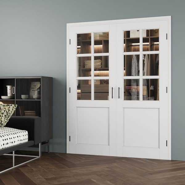 60 in. x 80 in. 6-Lite Clear Glass Universal White Solid Core Glass Double Prehung French Door+ Quick Jamb&Ball Catch