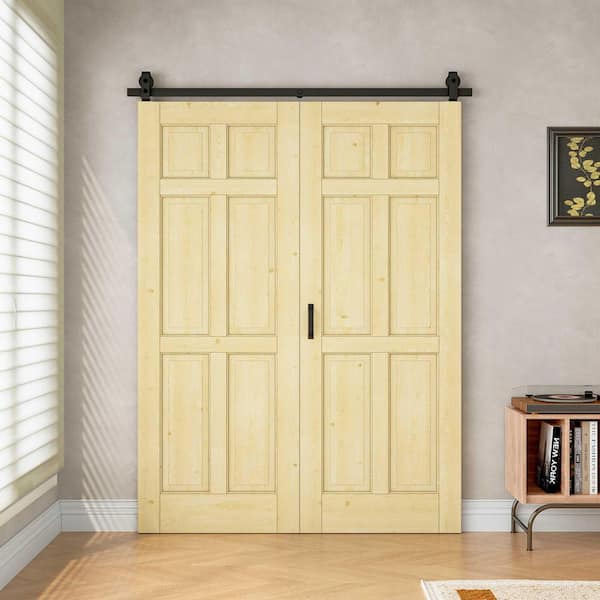 60 in. x 80 in. 6-Lite Panel Unfinished Solid Core Pine Wood Bifold Sliding Barn Door with Hardware Kit