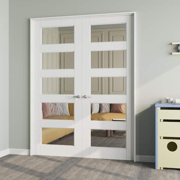 60 in. x 80 in. Universal 5-Lite Clear Glass White Solid Core Wood Double Prehung French Door with Quick Assemble Jamb
